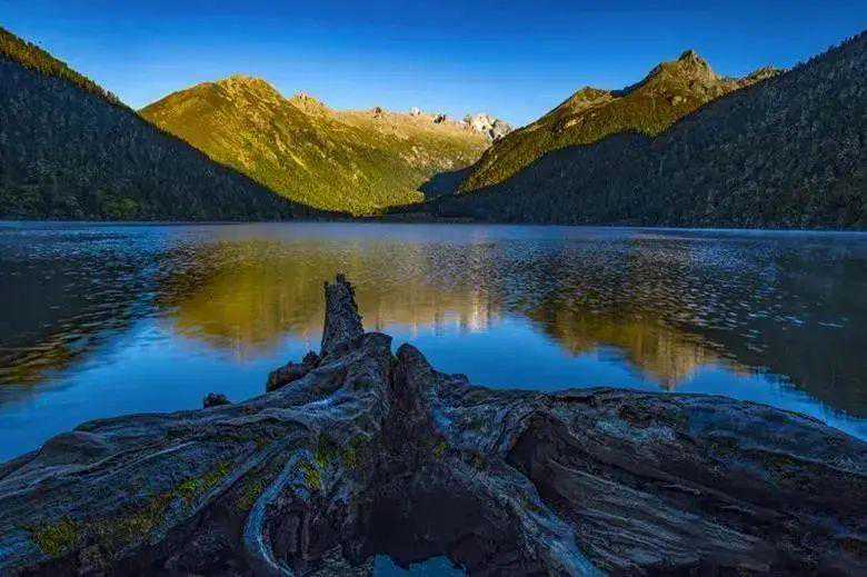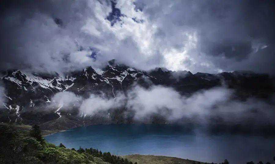 看雪色苍穹与月亮一起倒映在幽暗的湖面上