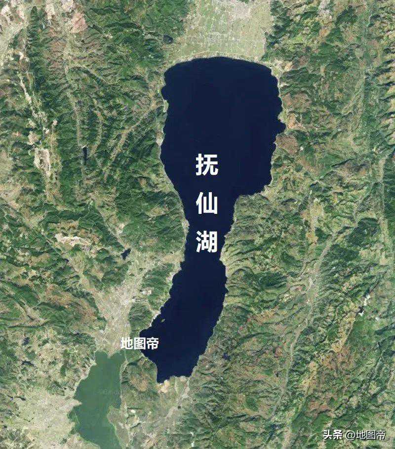 抚仙湖位于滇池东南方向约17千米,水面海拔约1721米,南北最长约31.5千米,东西最宽约11.5千米,面积约211平方千米。抚仙湖是断陷型深水湖泊,平均深度约90米,最大深度约155米,是中国第三深水湖泊,次于长白山天池(373米)和喀纳斯湖(188.5米)。