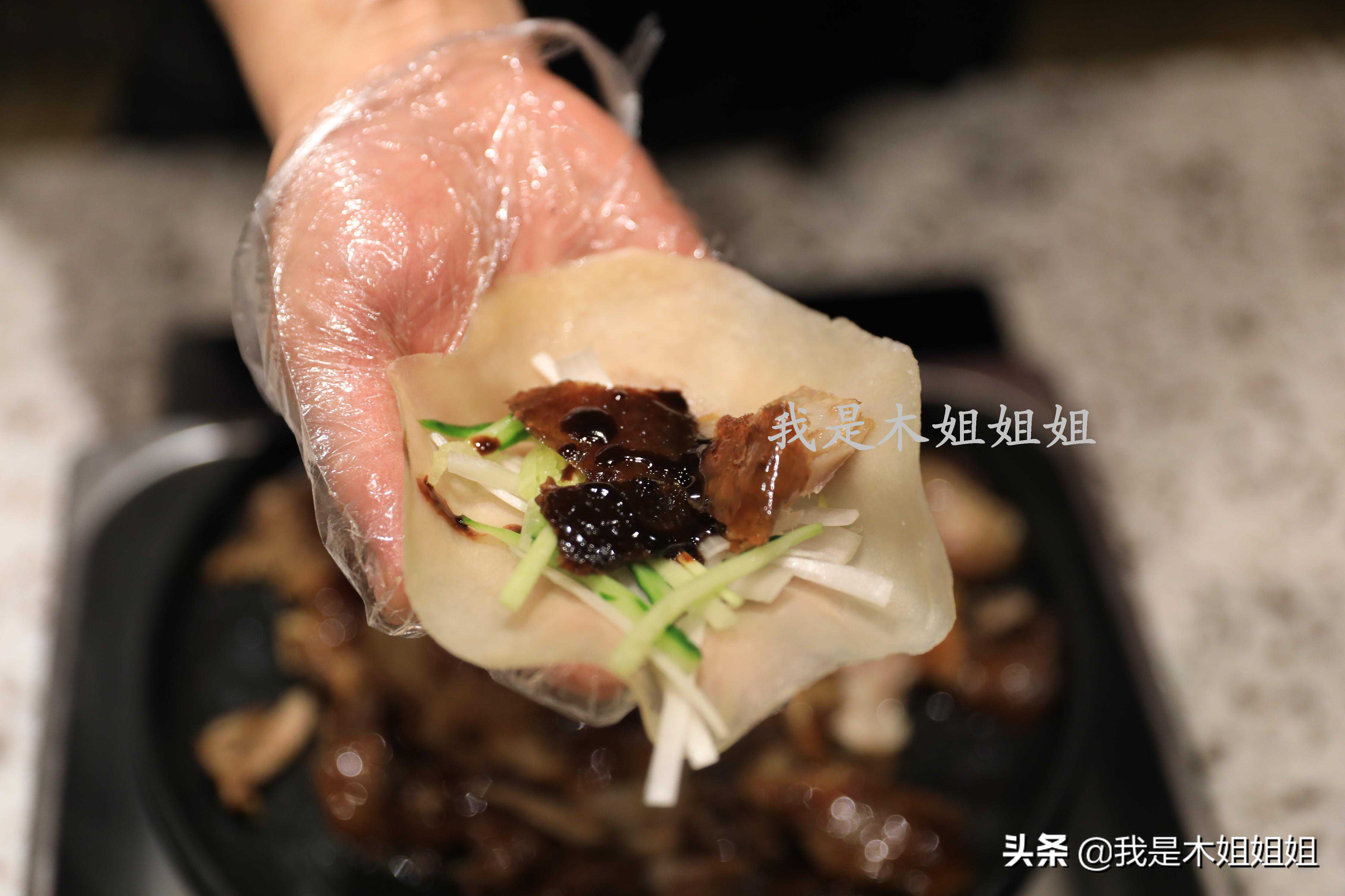 酱汁甜鲜的烤鸭卷饼。脆皮,鸭肉各来一点,葱丝黄瓜丝甜面酱,咸甜爽口,连吃三个都不腻。