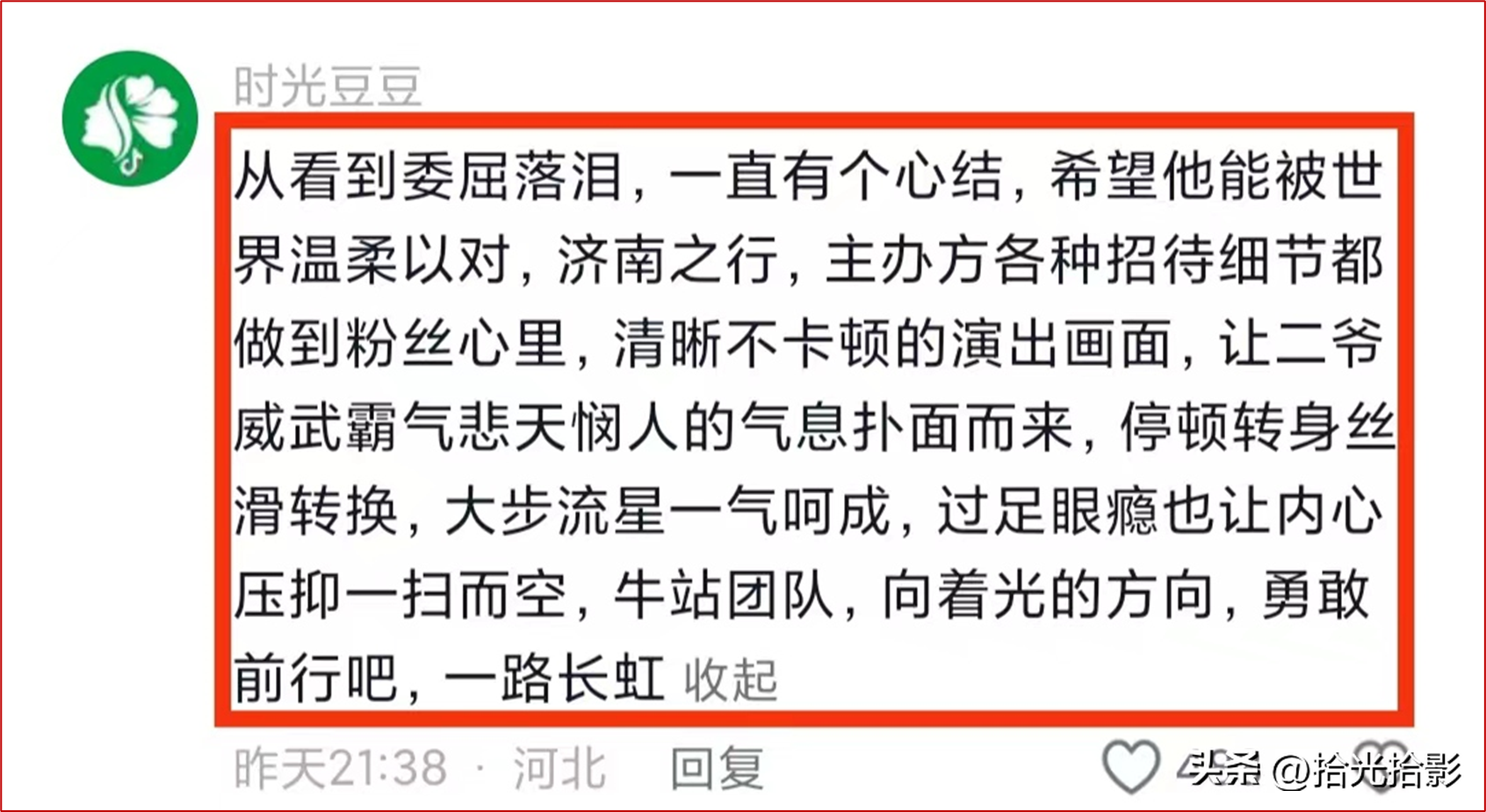 5、从看,到委屈落泪,一直有个心结,希望他能被世界温柔以对,济南之行,主办方各种招待细节都做到粉丝心里,清晰不卡顿的演出画面,让二爷威武霸气、悲天悯人的气息扑面而来,停顿、转身,丝滑转换,大步流星一气呵成,过足眼瘾,也让内心压抑一扫而空,牛站团队,向着光的方向,勇敢前行吧,一路长虹;