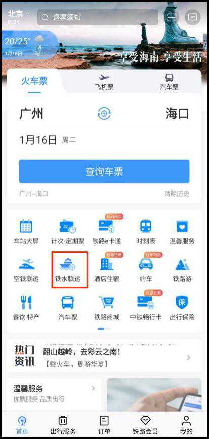 旅客可根据出行时间,自由选择铁路与公水联票的行程组合。旅客也可选择仅购买湛江西到海口的公水联程票。