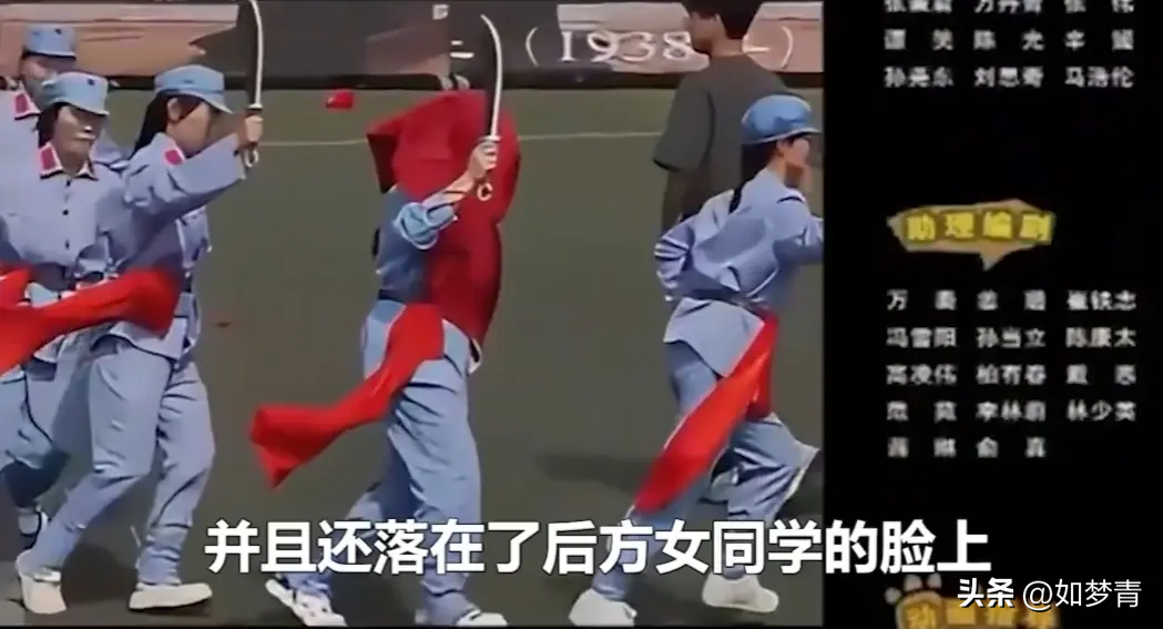 穿着八路军的衣服挥刀表演,本以为能跟上前面同学的步伐,一个不小心,旗就飞到了后面同学的脸上,心想:真的是无语,把我视线都挡住了,难搞哦!
