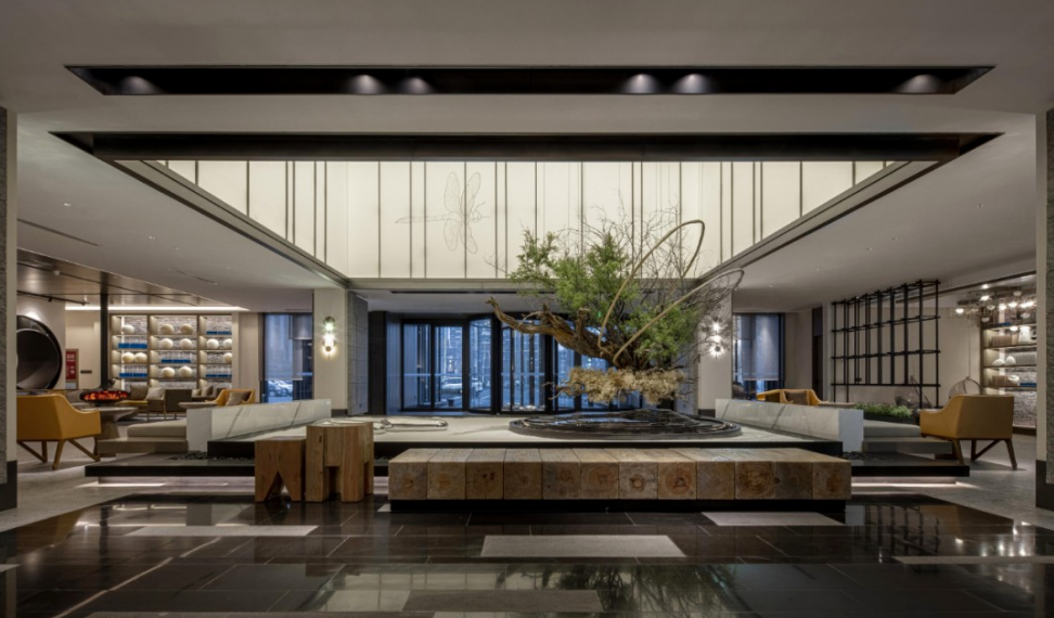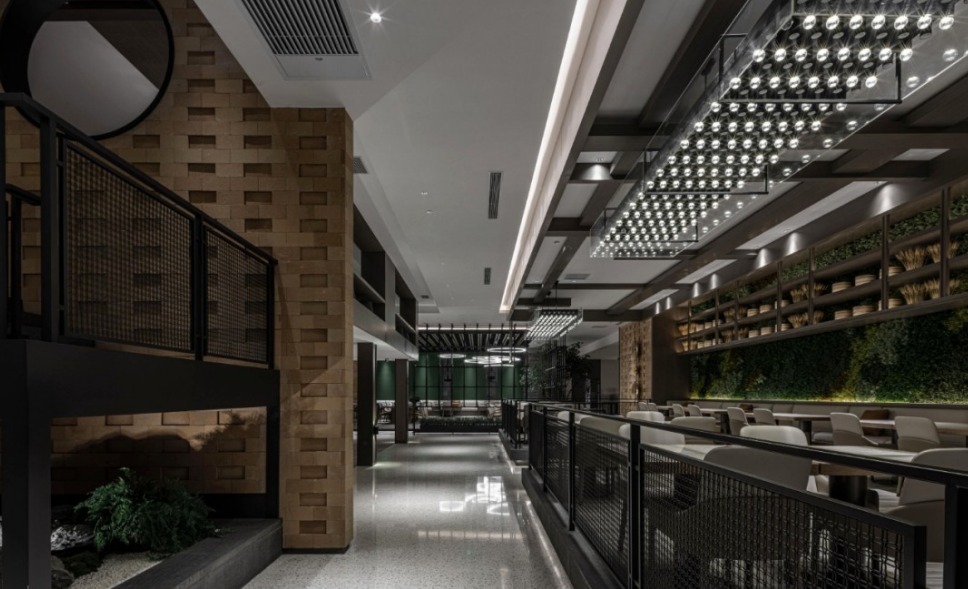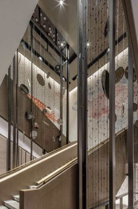 地处车来车往、人流不息的闹市区,设计在用竹林与山石相互掩映之下,同时又体现自然生命活力的“鱼跃龙门”艺术装置掀开室内的序幕。