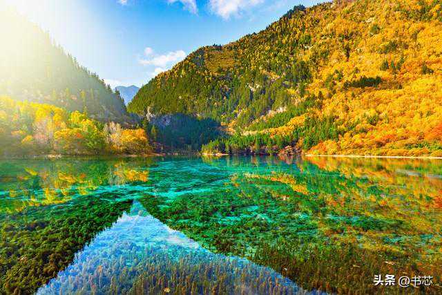 秋日的五花海是最为绚烂的。秋风轻拂,湖水泛起阵阵涟漪,将五彩斑斓的倒影摇曳得如梦如幻。阳光透过云层,洒在湖面上,宛如金色的琴弦,弹奏出天籁之音。五花海的水,清冽而纯净,犹如童话中的魔法源泉,每一滴水珠都闪耀着梦幻的光泽。